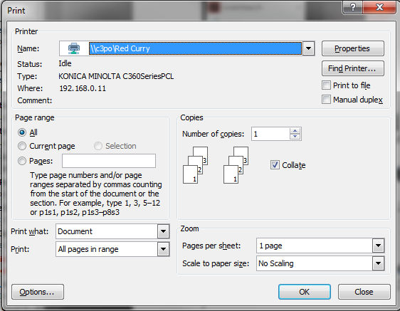 In the print window of the document you wish to print, click on Properties.