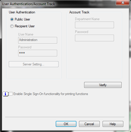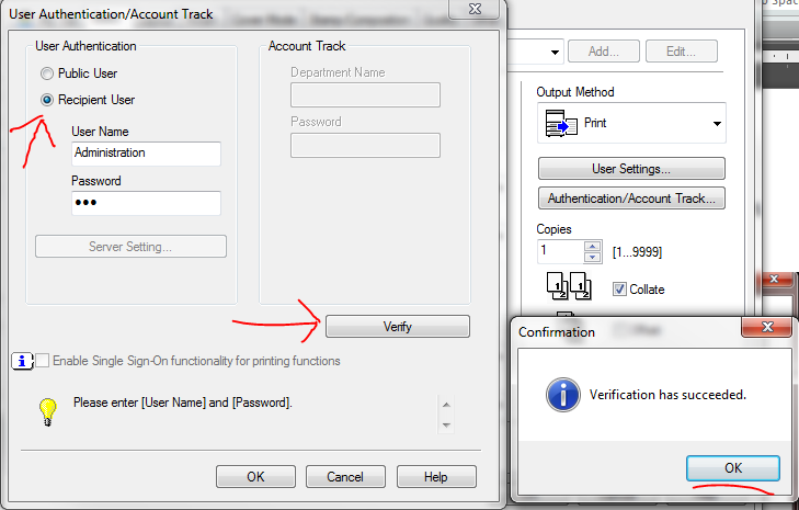 To setup color printing, select the Recipient User and enter the correct department User Name and Associated Password. Now verify the department credentials by clicking on the Verify button. You should see the Confirmation window appear.