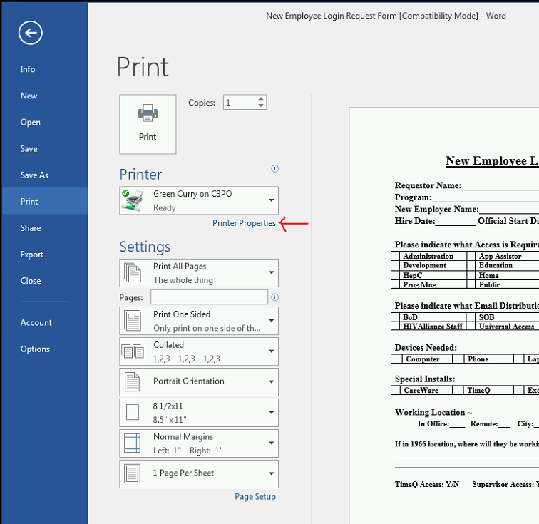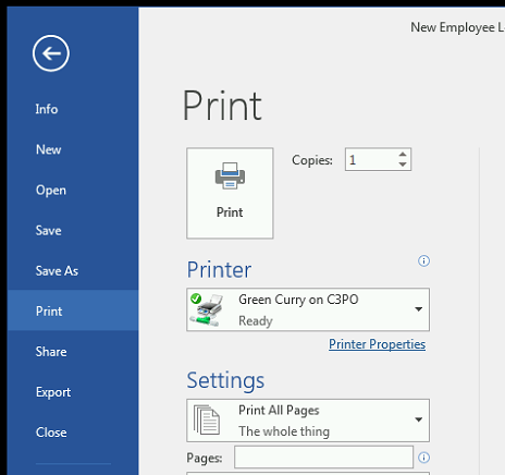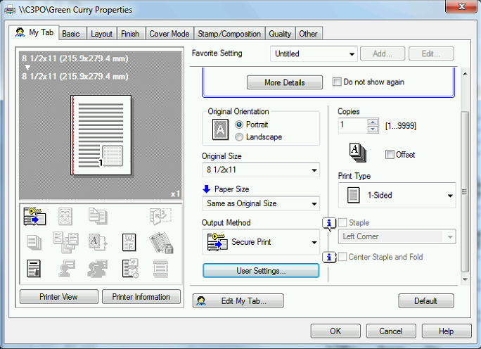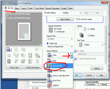 In the Properties window select the My Tab and click on the down arrow for Output Method.