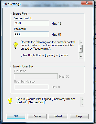 The Secure Print function allows you to set an ID and a password for print data and to save the data in a box (Secure Print User Box) on the printer. Because the data is not printed within a short time period, this function prevents printed materials from being missing or left unattended.