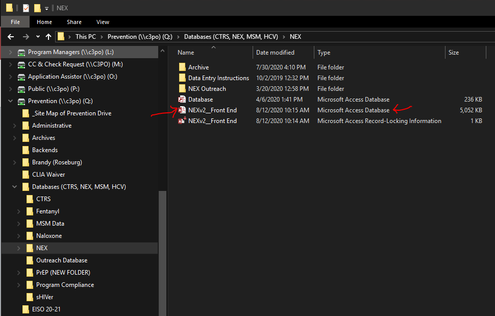 Open the prevention folder and go to Databases (CTRS, NEX, MSM, HCV) and then NEX.