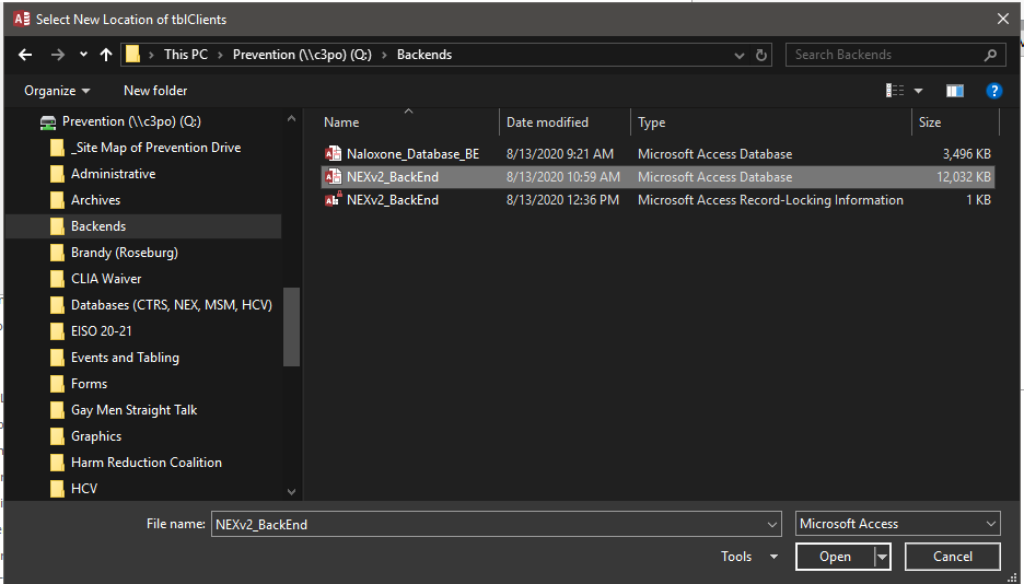 Navigate to Prevention/Backends and select the NEXv2_BackEnd Microsoft Access Database file and then click the Open button.