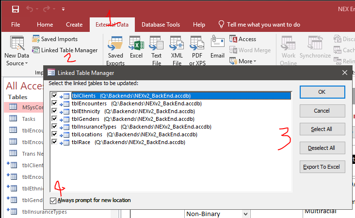 - When the Linked Table Manager window opens click on the Select all button on the right