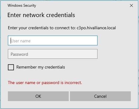 Put 'hivalliance\' in front of your user name (hivalliance\user name) and then enter your current password.