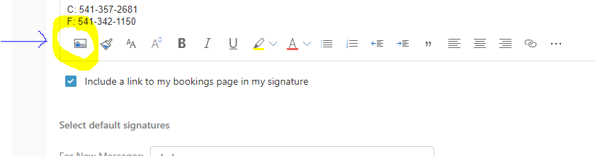 - To add your preferred logo to your signature, place your cursor where you want the logo (between your title and your office address) and click on the insert picture button (mountain graphic, first option on the list, highlighted here)