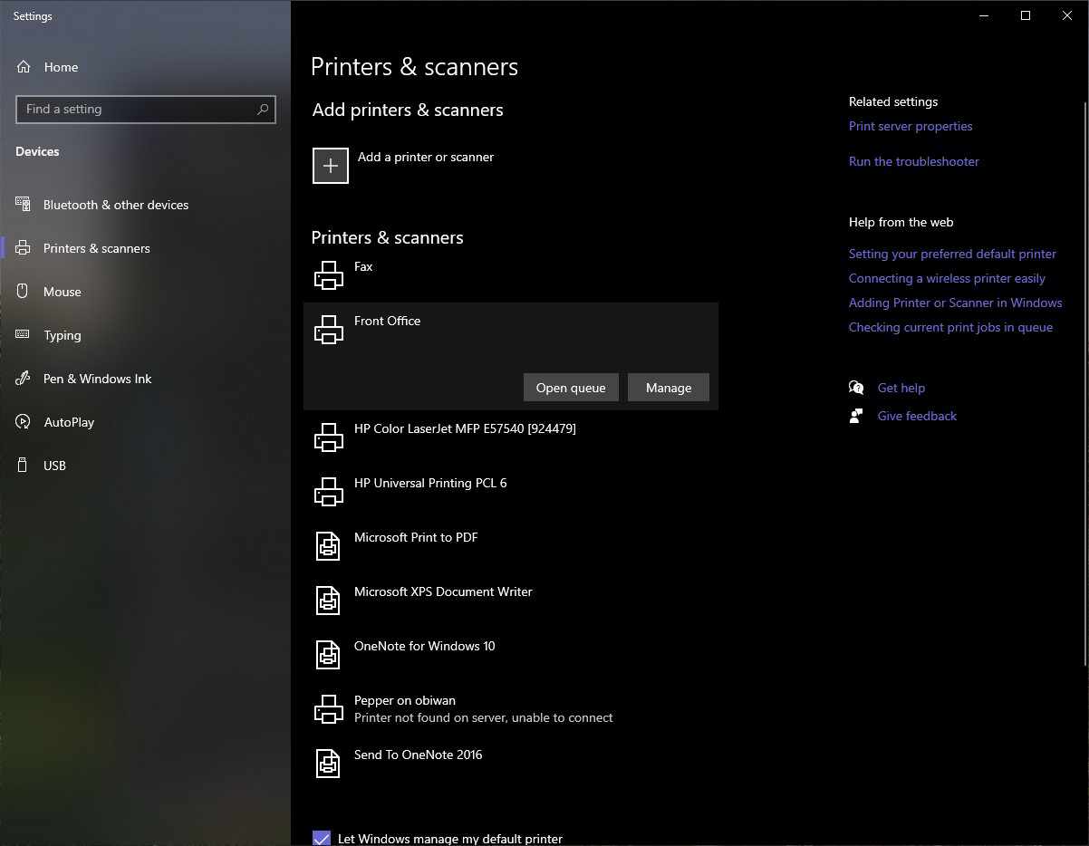 2. Once in the “Printers & scanners” settings window, click on your office’s primary printer. In my office it’s called “Front Office.” And then click the “Manage” button.
