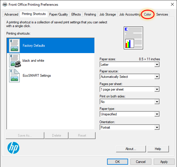 4. Now the Printing Preferences page should be open with the “Printing Shortcuts” tab showing. Then, click on the “Color” tab.