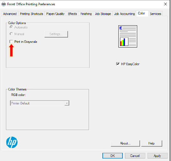 7. Click “Apply” and then “OK.” Your computer should now automatically print in black and white.