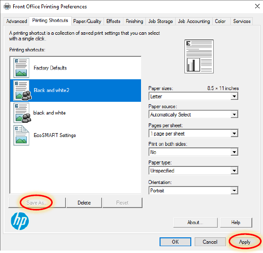 6. Go back to the “Printing Shortcuts” page, click “Save As…” and name your new preset “Black and white” (The new one I made for this training is called “Black and white 2”).